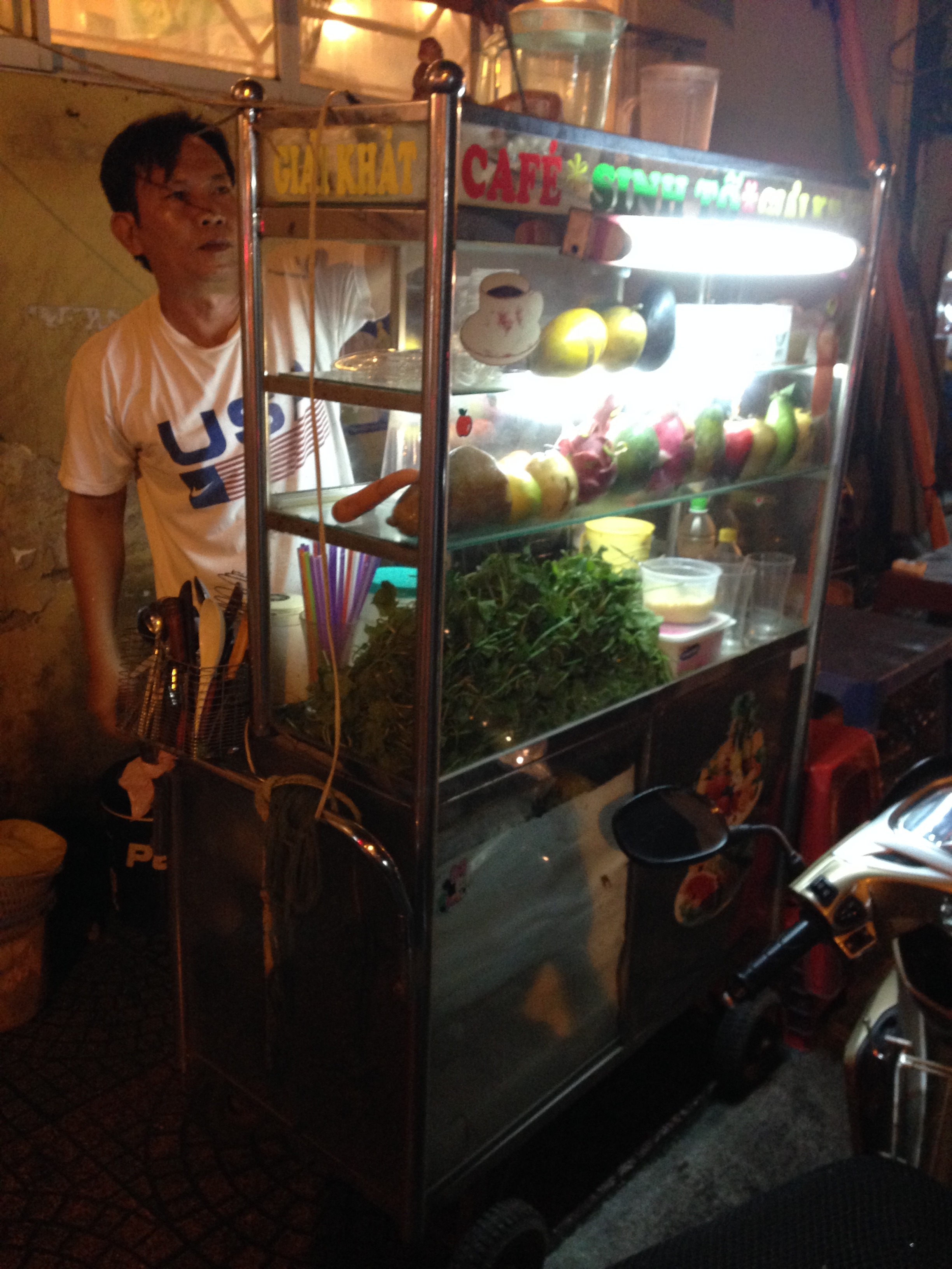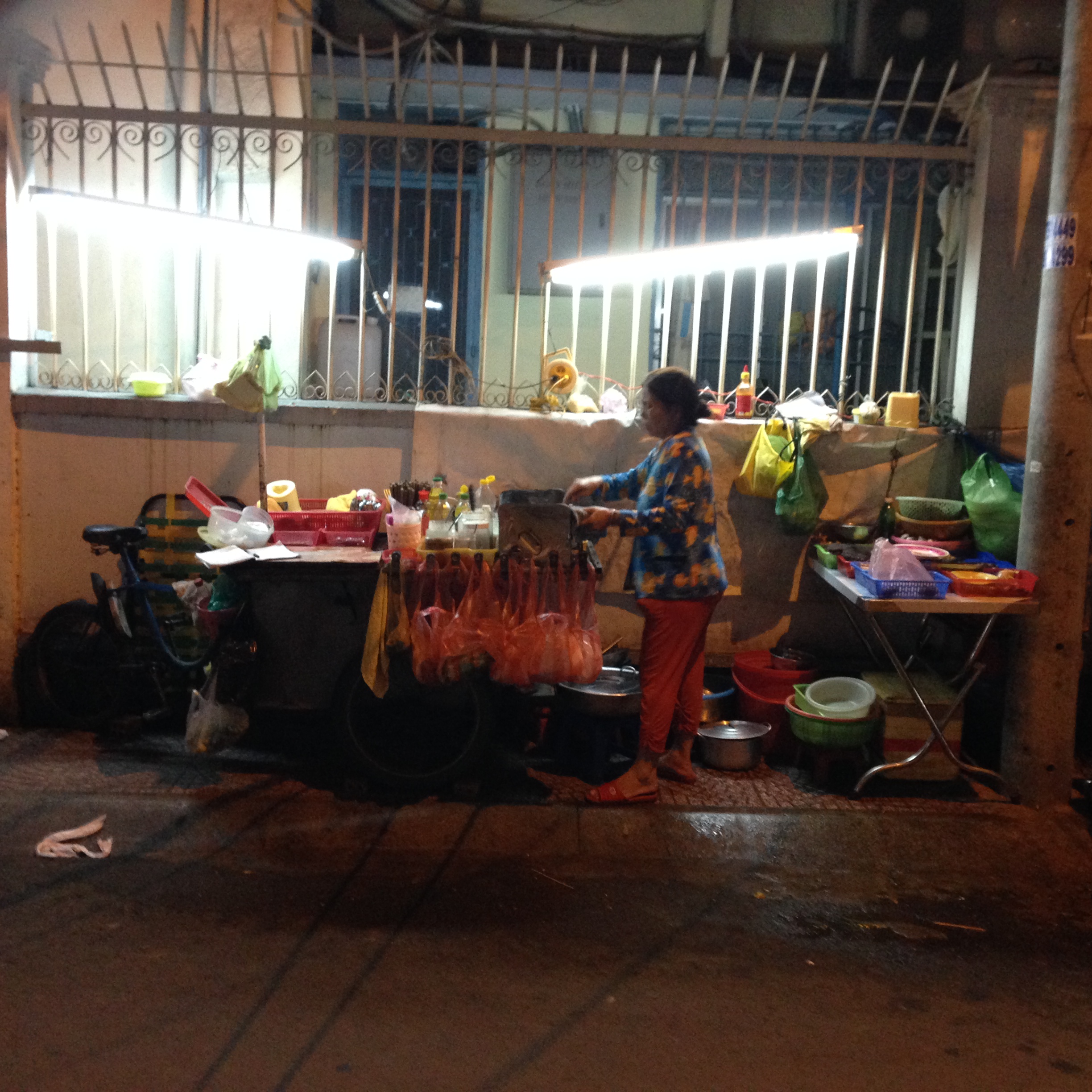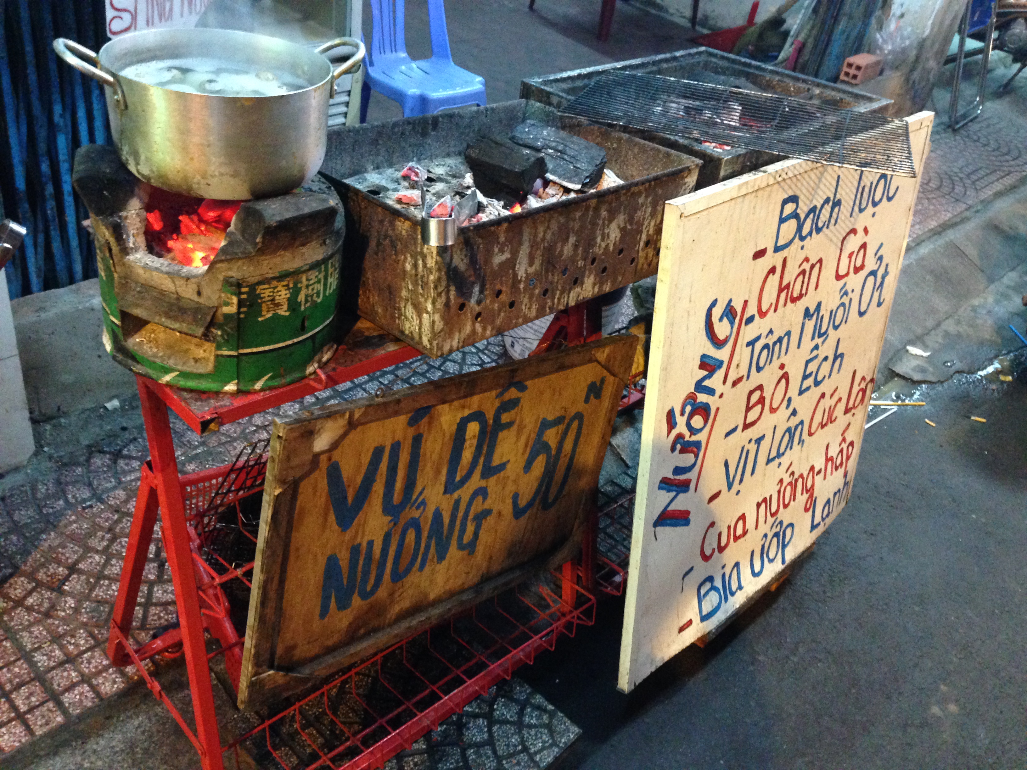Tout se passe sur les trottoirs au milieu d’innombrables scooters garés en dépit du bon sens, plutôt dans des rues étroites que sur les avenues, dans une vague échoppe ou bien avec juste un réchaud posé à même le sol ou encore un chariot à tout faire (stockage, vitrine, cuisson). L’endroit est entouré d’un mobilier en plastique de la taille de ceux qui existent dans les écoles maternelles. Dégustation inconfortable, mais nourriture locale garantie (soupes, « fondues » de légumes, crêpes, fritures, brochettes…) et pour un prix du plat bien inférieur à un demi Euro.