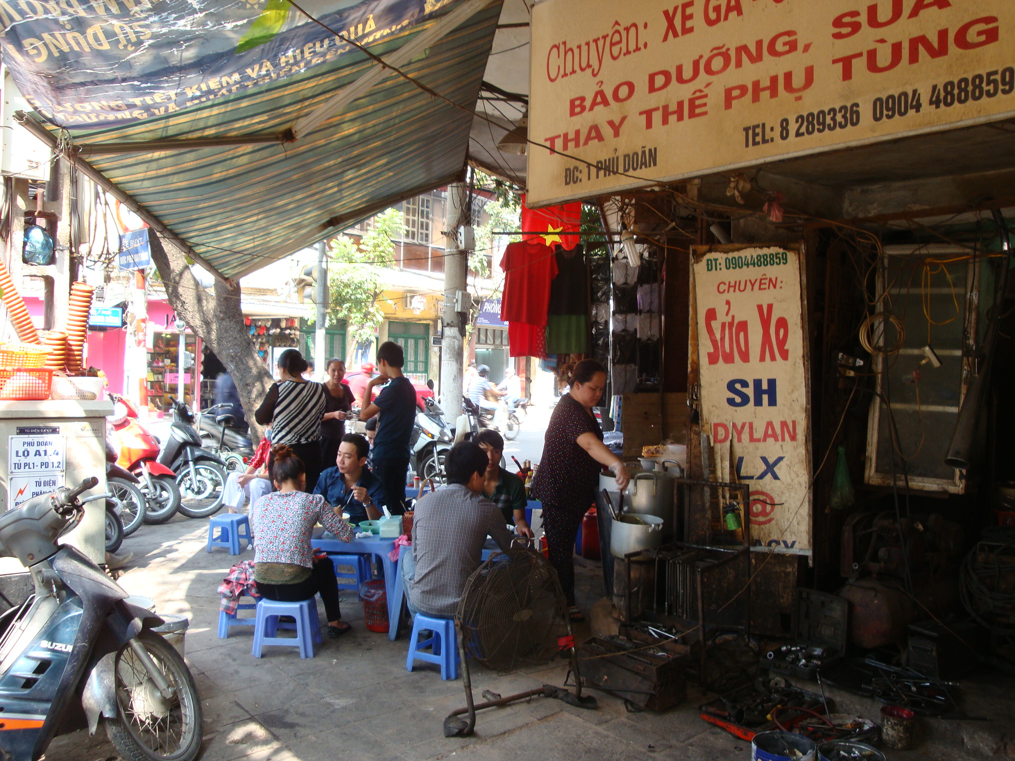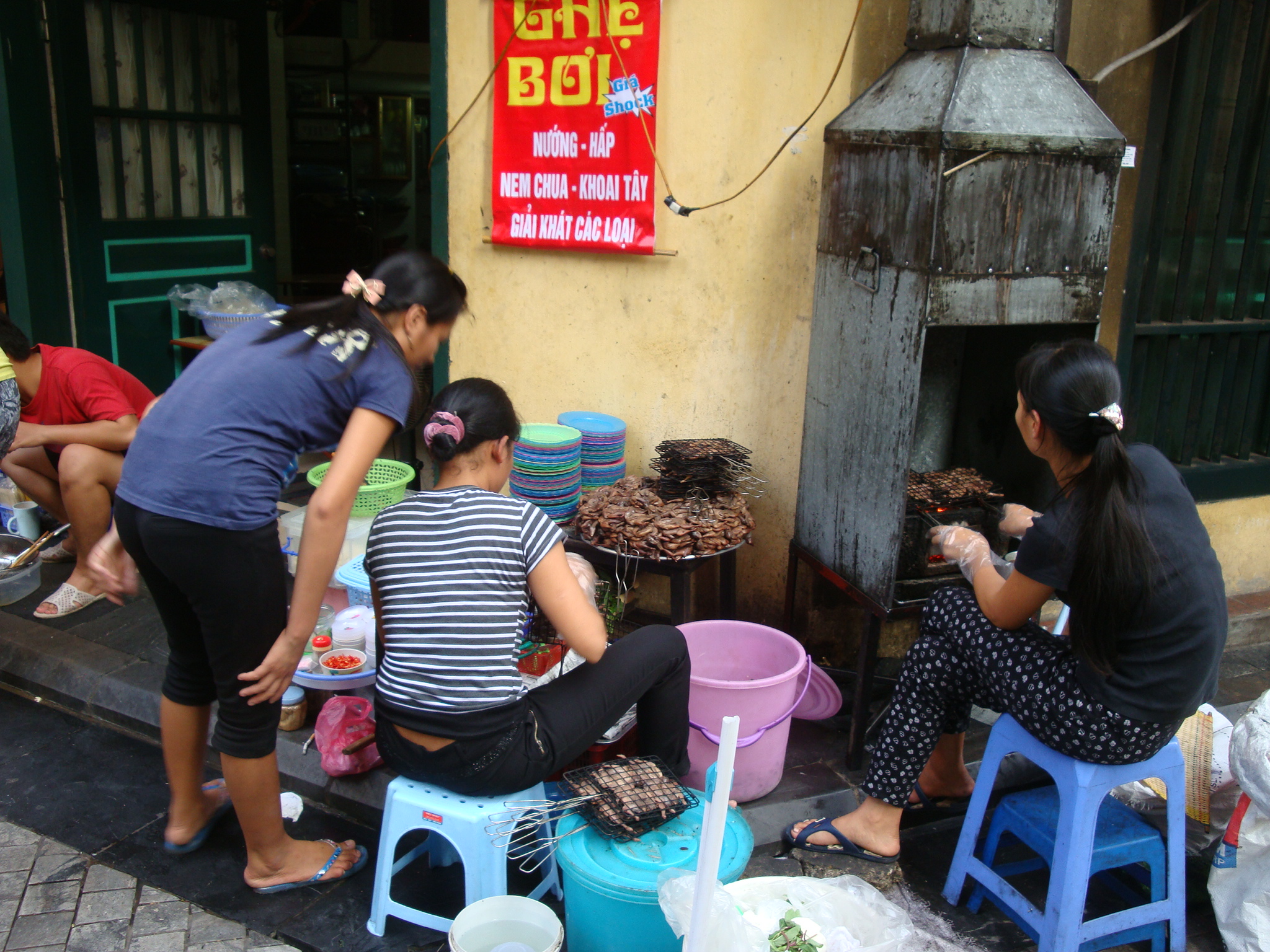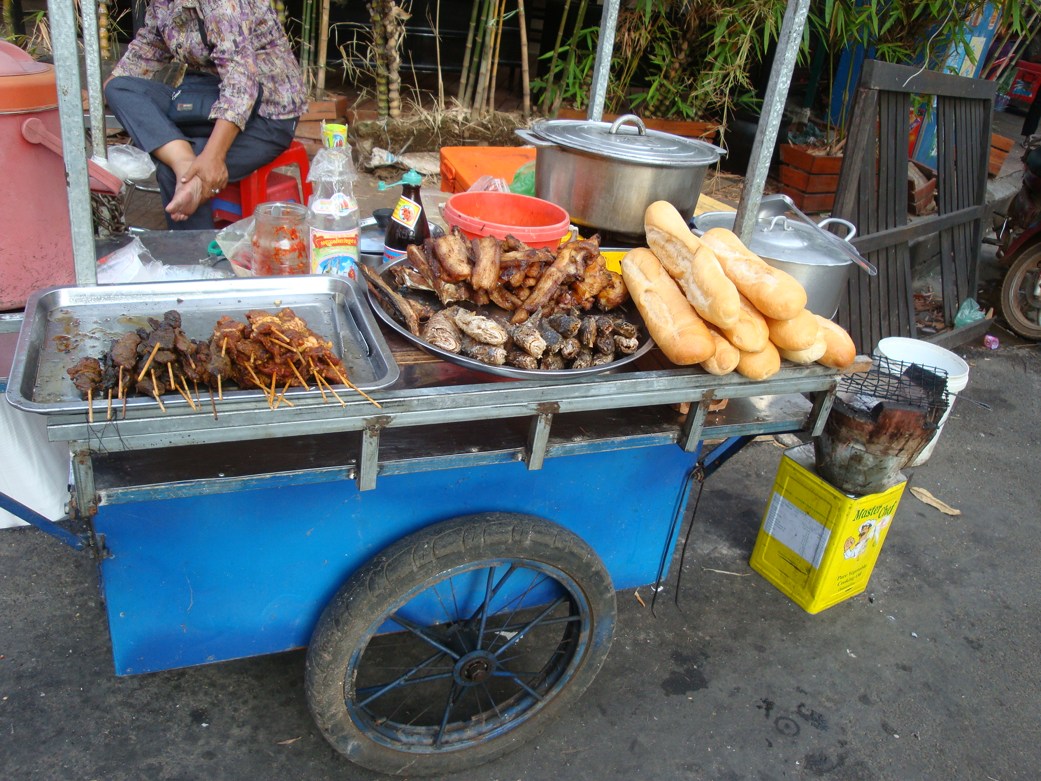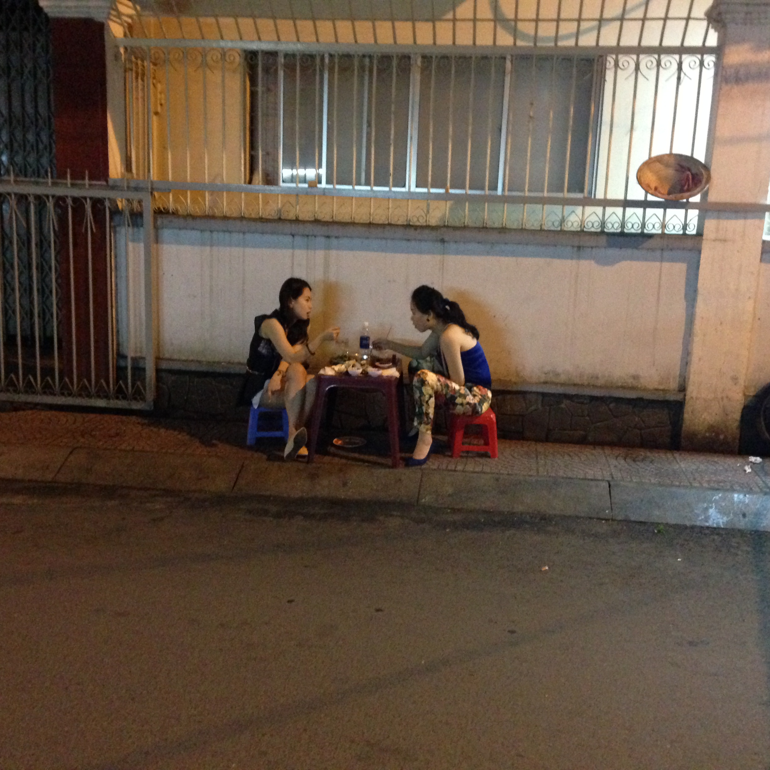 Tout se passe sur les trottoirs au milieu d’innombrables scooters garés en dépit du bon sens, plutôt dans des rues étroites que sur les avenues, dans une vague échoppe ou bien avec juste un réchaud posé à même le sol ou encore un chariot à tout faire (stockage, vitrine, cuisson). L’endroit est entouré d’un mobilier en plastique de la taille de ceux qui existent dans les écoles maternelles. Dégustation inconfortable, mais nourriture locale garantie (soupes, « fondues » de légumes, crêpes, fritures, brochettes…) et pour un prix du plat bien inférieur à un demi Euro.